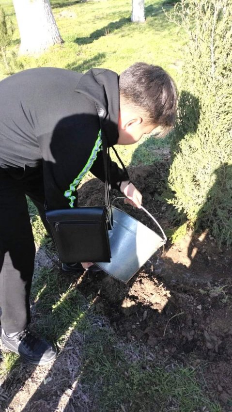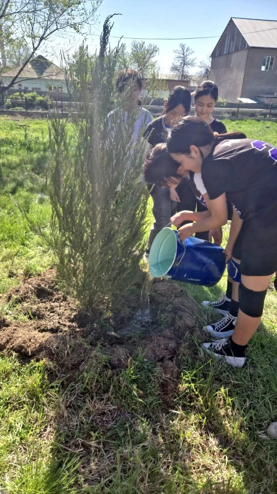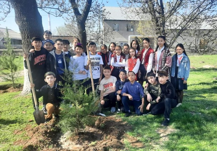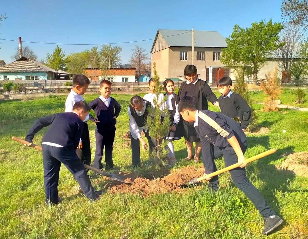 Экология және еңбек жобасы аясында ұйымдастырылған бұл бастамаға мектеп мұғалімдері мен оқушылары қатысып ауланың көкалдануына өз үлестерін қосты.
