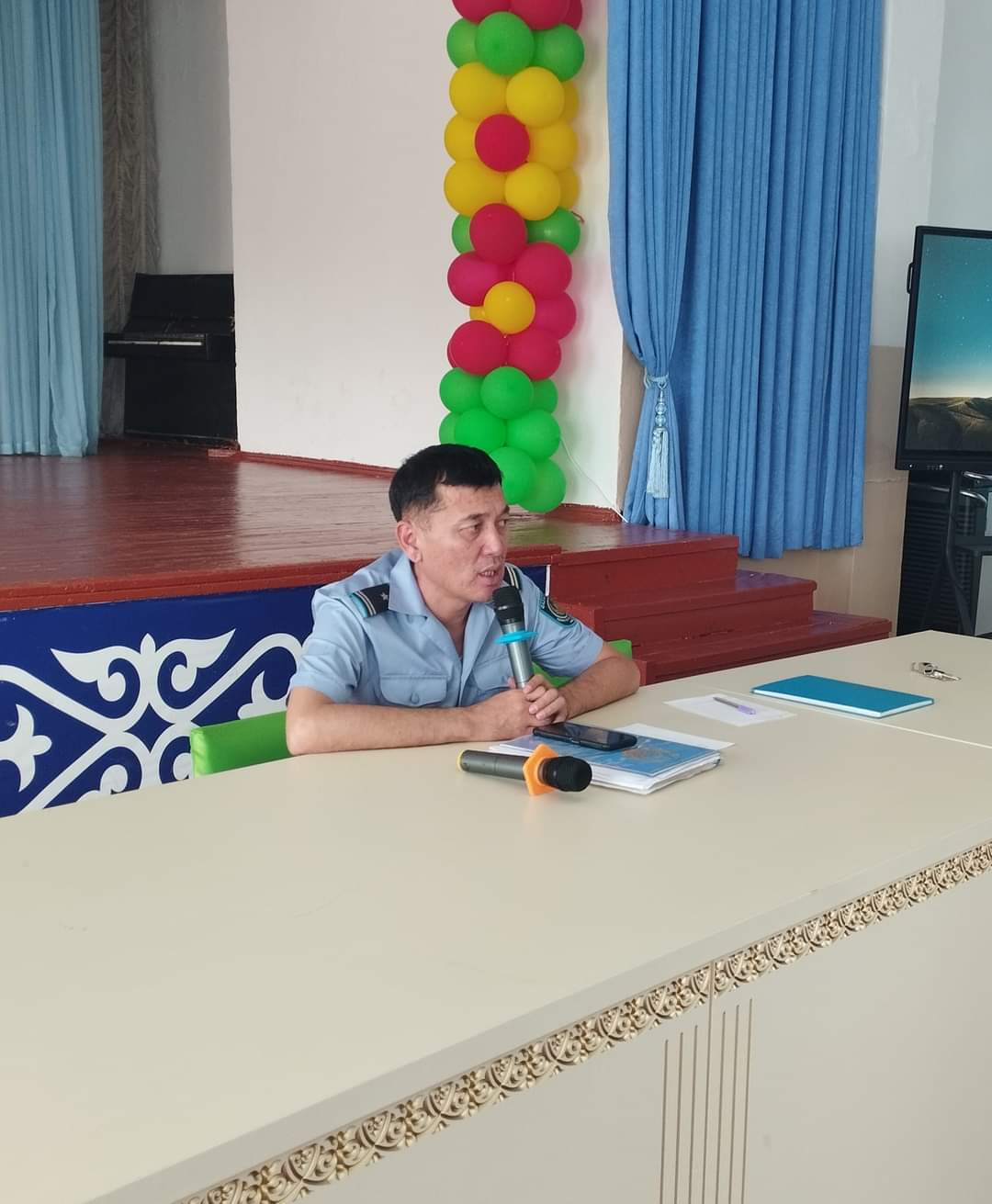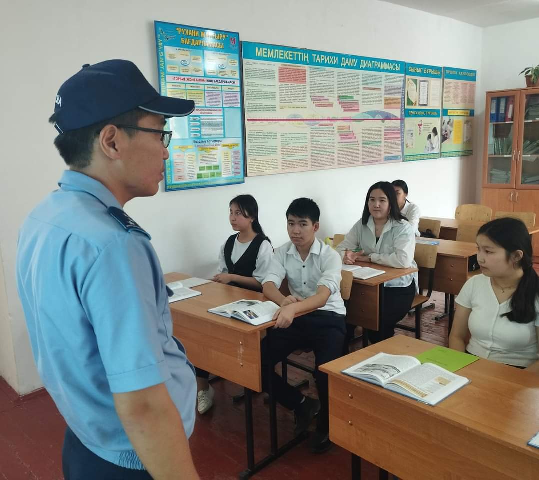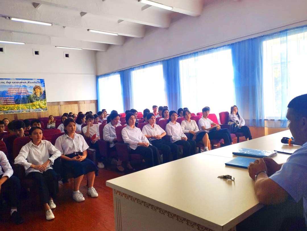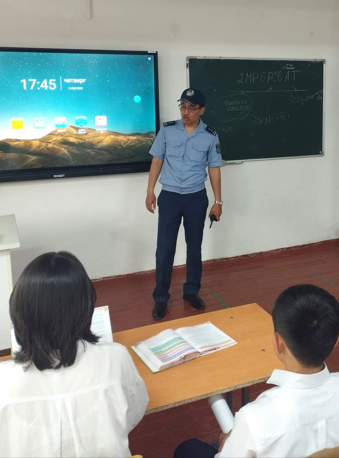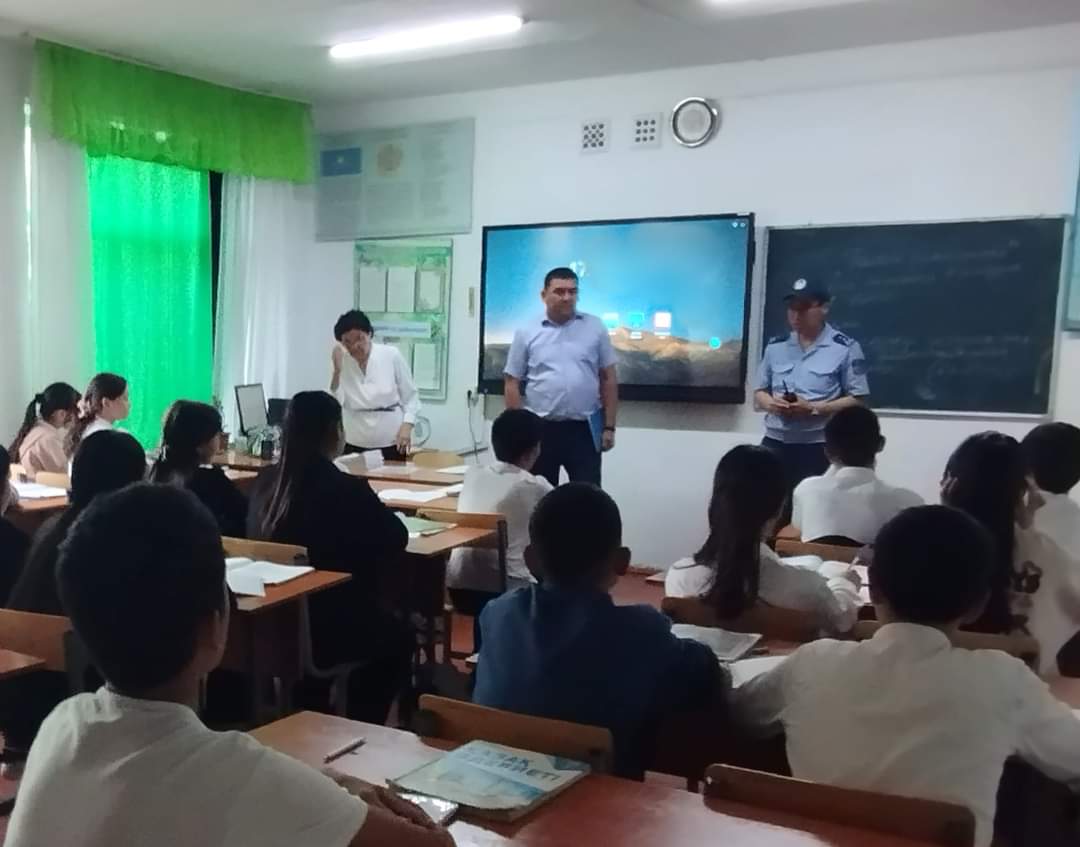 Кездесу барысында Тұран аудандық ПБ ЖПҚБ ЮПБ полиция майоры Иргебаев Ж.Т, Тұран АПБ ЖПҚБ ЮПБ УПИ полиция капитаны Қанаев.Б.Қ оқушыларға адам құқықтары мен бостандықтары туралы, құқықбұзушылықтың алдын ала бойынша, интернет ресурстарындағы шектеу қойылған сайттардың зияндылығы және олардың құқық бұзушылыққа алып бару мүмкіндігі жолдарынан қорғану жөнінде түсіндірме жұмыстарын жүргізді.