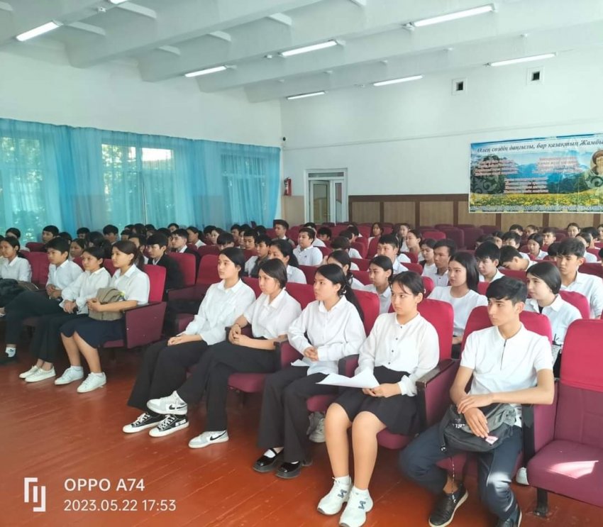 Шымкент қалалық білім басқармасына қарасты №26 Жамбыл атындағы мектеп-гимназиясында Шымкент қаласы білім басқармасының 25.04.2023 жылғы №10-07-07/2294 хаты негізінде, Шымкент қалалық білім басқармасының және Шымкент қалалық прокуратурасымен бірлескен «Мейірім - жүректен» атты айлық жоспарына сәйкес 22.05.2023 жылы «Заң – қоғамның негізгі тірегі» тақырыбында құқық қорғау өкілдерімен кездесу өткізілді.